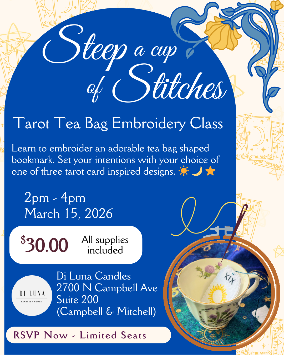 Spark your love of embroidery with this one-of-a-kind class! Learn how to create a cute bookmark modeled after tarot and tea. Your instructor, Jason, will provide you with one of 3 designs to create — YOUR CHOICE! Sign up today!